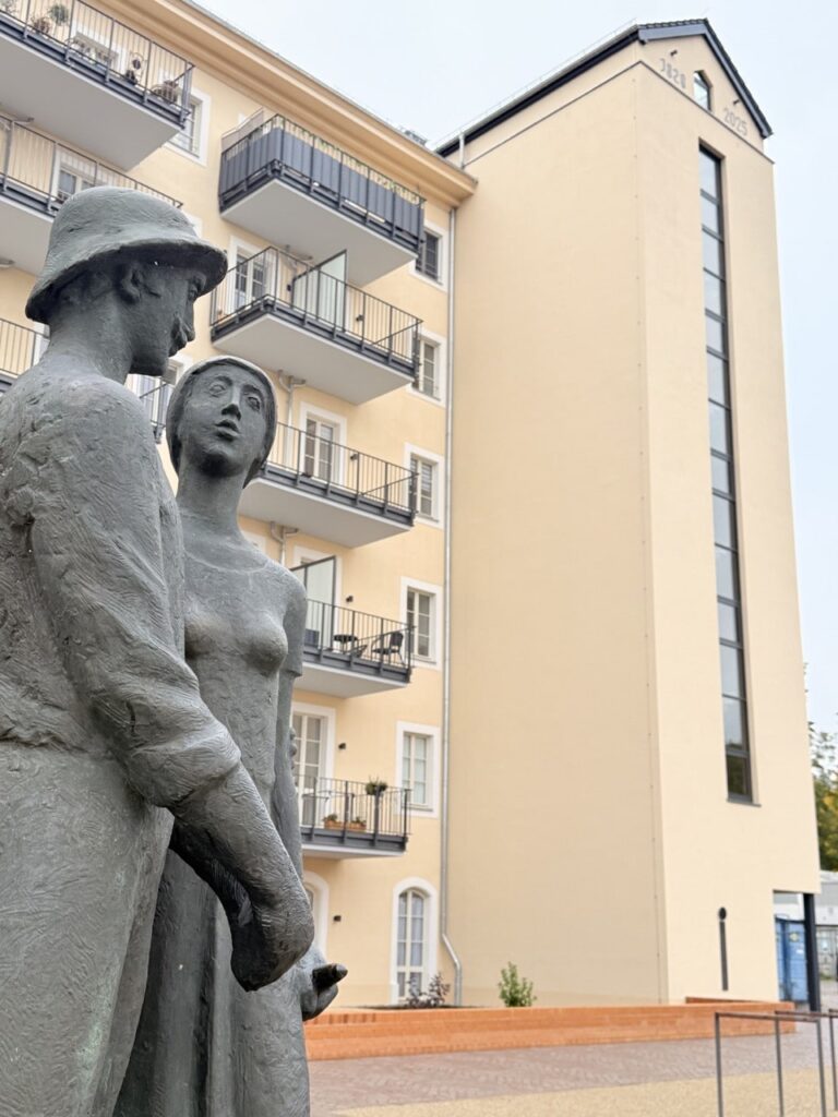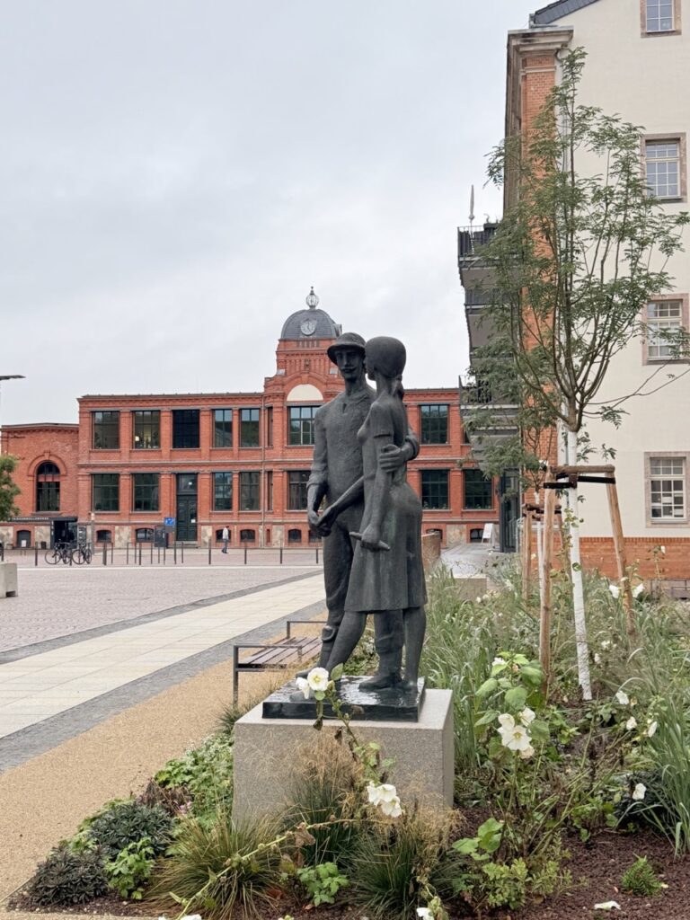….Am 1. Oktober 2025 hat die Stadtverwaltung Flöha ein erstes großes Teilstück des neuen Marktplatzes in der Alten Baumwolle freigegeben. Dabei handelt es sich um die Platzfläche zwischen dem „Oederaner Bau“ und den sanierten Altbauten. Auf dem Areal wurden bereits Wege und Grünflächen angelegt sowie Sitzbänke installiert. Besonderes Augenmerk galt bei der Eröffnung der Bronzeplastik „Französischer Bergarbeiter und Flöhaer Spinnerin/Flöha/Mericourt“, die die Städtepartnerschaft mit der französischen Stadt Méricourt symbolisiert.