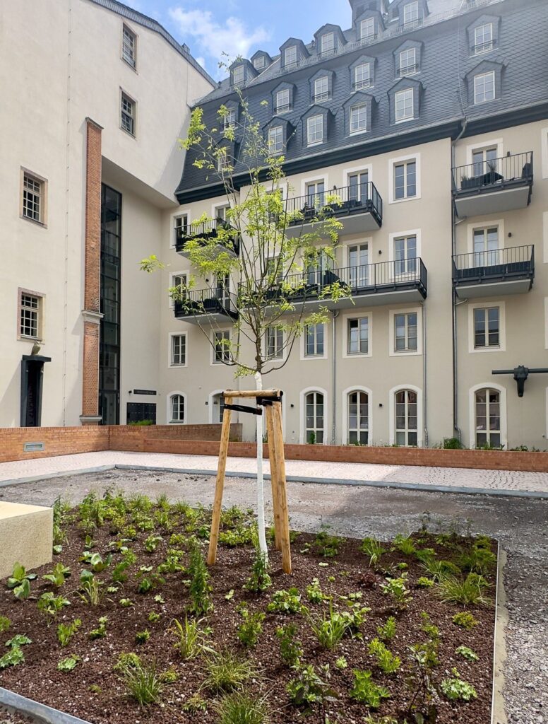 ….Am 1. Oktober 2025 hat die Stadtverwaltung Flöha ein erstes großes Teilstück des neuen Marktplatzes in der Alten Baumwolle freigegeben. Dabei handelt es sich um die Platzfläche zwischen dem „Oederaner Bau“ und den sanierten Altbauten. Auf dem Areal wurden bereits Wege und Grünflächen angelegt sowie Sitzbänke installiert. Besonderes Augenmerk galt bei der Eröffnung der Bronzeplastik „Französischer Bergarbeiter und Flöhaer Spinnerin/Flöha/Mericourt“, die die Städtepartnerschaft mit der französischen Stadt Méricourt symbolisiert.