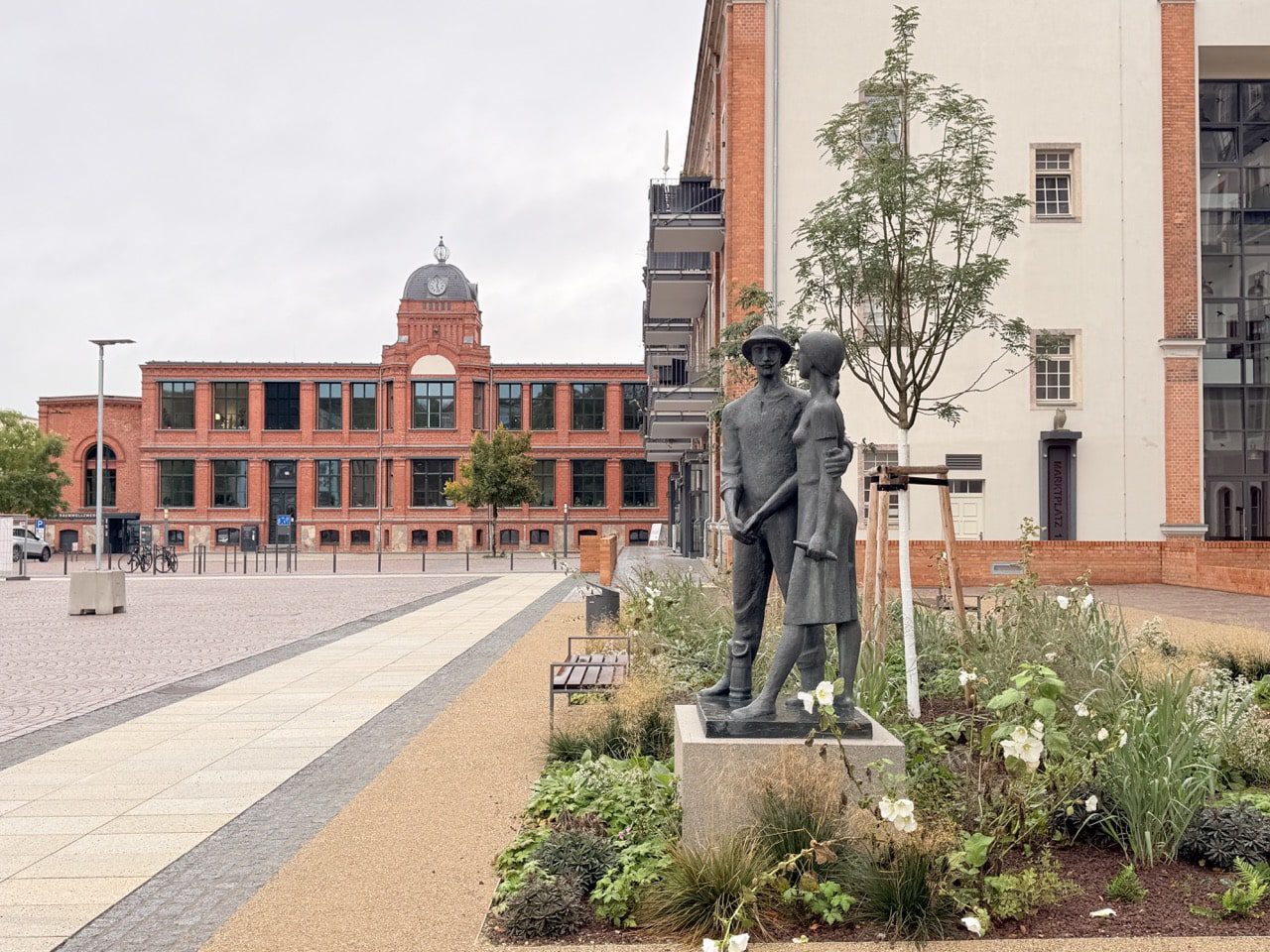 ….Am 1. Oktober 2025 hat die Stadtverwaltung Flöha ein erstes großes Teilstück des neuen Marktplatzes in der Alten Baumwolle freigegeben. Dabei handelt es sich um die Platzfläche zwischen dem „Oederaner Bau“ und den sanierten Altbauten. Auf dem Areal wurden bereits Wege und Grünflächen angelegt sowie Sitzbänke installiert. Besonderes Augenmerk galt bei der Eröffnung der Bronzeplastik „Französischer Bergarbeiter und Flöhaer Spinnerin/Flöha/Mericourt“, die die Städtepartnerschaft mit der französischen Stadt Méricourt symbolisiert.